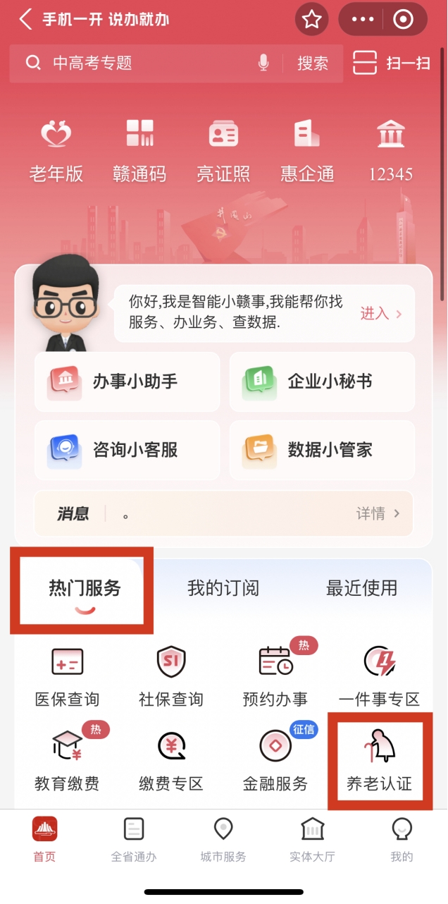 步骤二:在赣服通的“热门服务”中,选择“养老认证”或直接在赣服通搜索“养老待遇认证”。