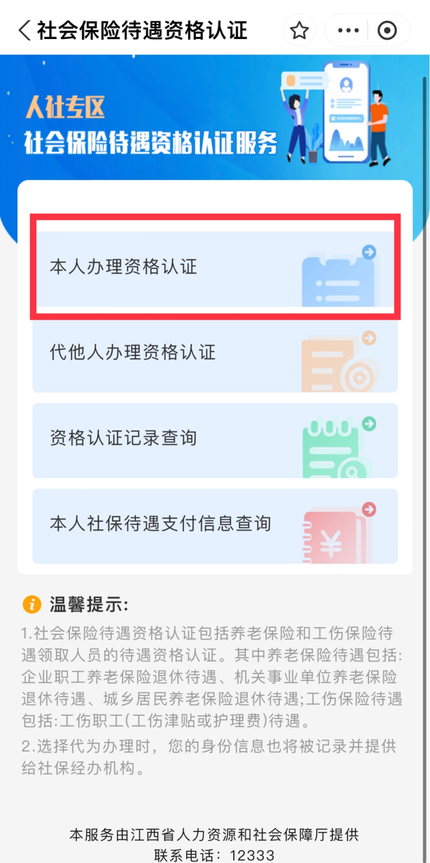 步骤三:进入页面之后,如是待遇领取人本人登录赣服通认证的,则选择“本人办理资格认证”,进行人脸识别,即可开展资格认证。若是亲友等他人登录赣服通帮助认证的,则选择“代他人办理资格认证”,录入待遇领取人姓名和身份证号码,然后待遇领取人本人进行人脸识别,即可开展资格认证。