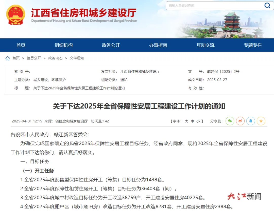 为确保完成国家确定的江西省2025年保障性安居工程目标任务,经省政府同意,省住房城乡建设厅、省发展改革委、省财政厅联合下达2025年全省保障性安居工程建设工作计划。