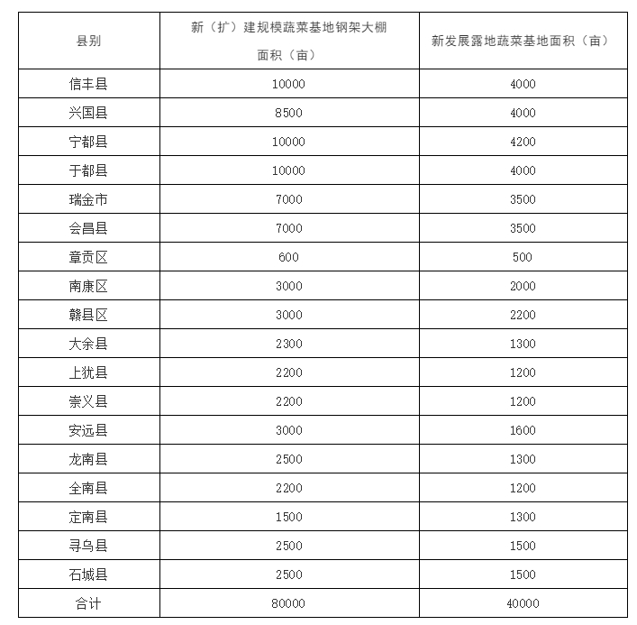 围绕扩大规模、提升质量、补好短板等重点,以推动蔬菜产业高质量发展为主线,全年新(扩)建规模蔬菜基地钢架大棚8万亩,规模露地蔬菜基地4万亩;改造提升原有设施和露地基地,提高基地运营和种植水平;突出分级包装、冷藏保鲜和销售体系等短板,推动服务体系向产前产后延伸;继续打造宁都等6个重点县(市),培育一批重点乡镇、专业村(组),带动更多农民成为种菜主体、基本菜农。![]()