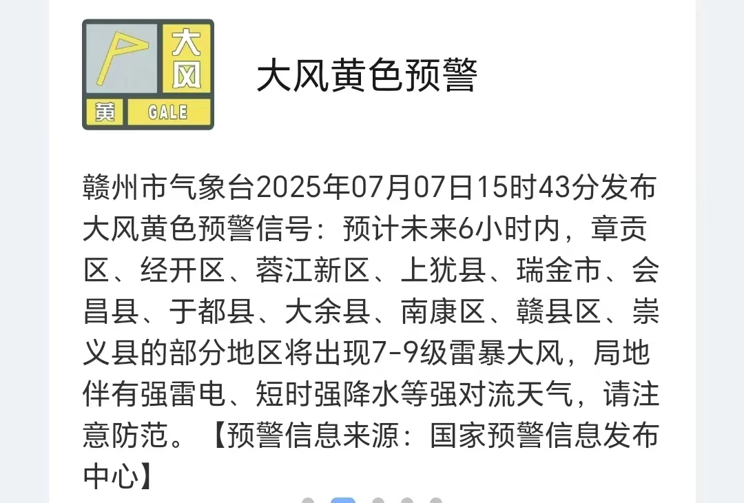 赣州市气象台2025年07月07日15时43分发布大风黄色预警信号:预计未来6小时内,章贡区、经开区、蓉江新区、上犹县、瑞金市、会昌县、于都县、大余县、南康区、赣县区、崇义县的部分地区将出现7-9级雷暴大风,局地伴有强雷电、短时强降水等强对流天气,请注意防范。