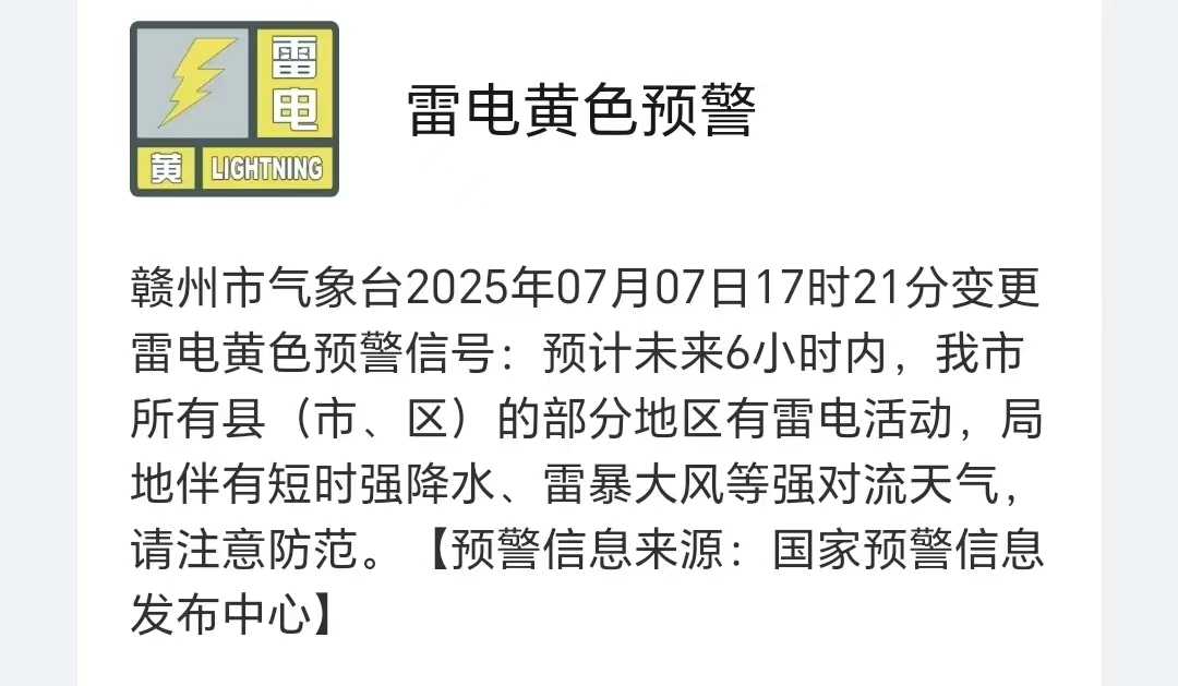赣州市气象台2025年07月07日17时21分变更雷电黄色预警信号:预计未来6小时内,我市所有县(市、区)的部分地区有雷电活动,局地伴有短时强降水、雷暴大风等强对流天气,请注意防范。