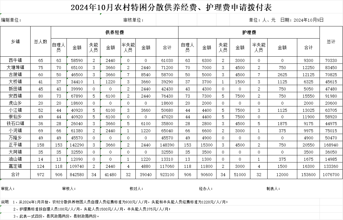 2024年10月农村特困分散供养经费、护理费申请拨付表
