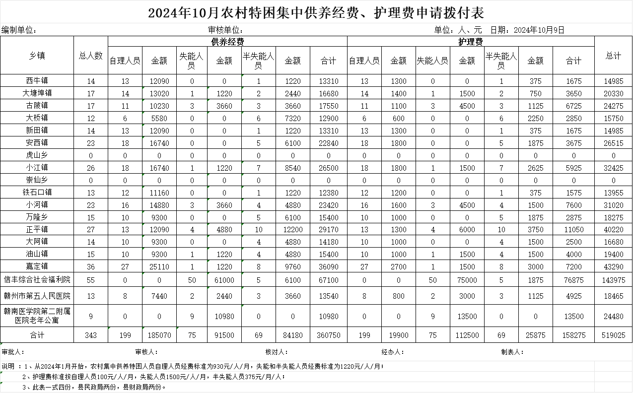 2024年10月农村特困集中供养经费、护理费申请拨付表