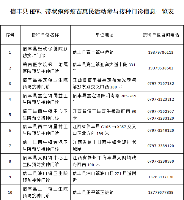 HPV疫苗、重组带状疱疹疫苗惠民接种活动参与单位信息如下表,线下现场预约及具体接种事宜,详情可电话咨询。