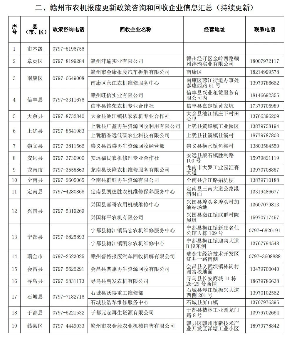 赣州市农机报废更新补贴政策告知单