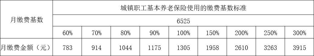 月缴费金额分别为783元、914元、1044元、1175元、1305元、1958元、2610元、3263元、3915元。