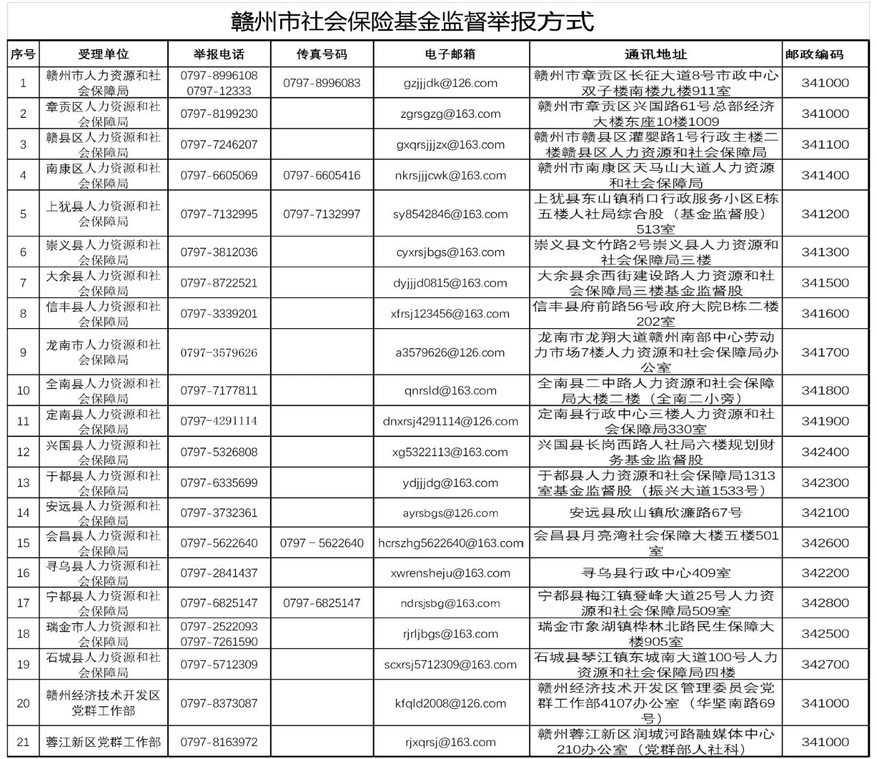 为发挥社保基金社会监督作用,切实维护全市社保基金安全,赣州市人社局设立举报投诉,欢迎社会各界和广大群众对涉嫌欺诈骗取、套取或者挪用贪占社保基金的违法违纪违规行为进行举报。